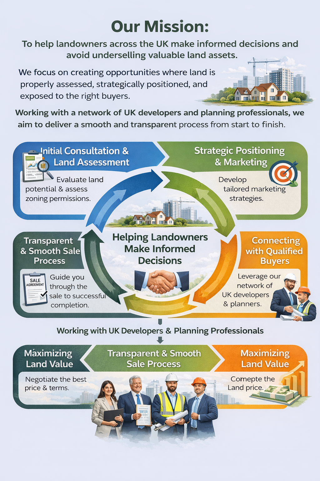 We assess land, explore planning potential, and connect landowners with experienced developers to secure competitive offers.